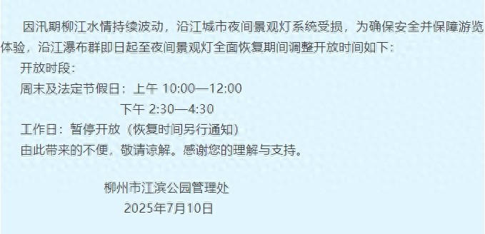 因汛期柳江水情持续波动,沿江城市夜间景观灯系统受损,为确保安全并保障游览体验,沿江瀑布群即日起至夜间景观灯全面恢复期间调整开放时间如下: